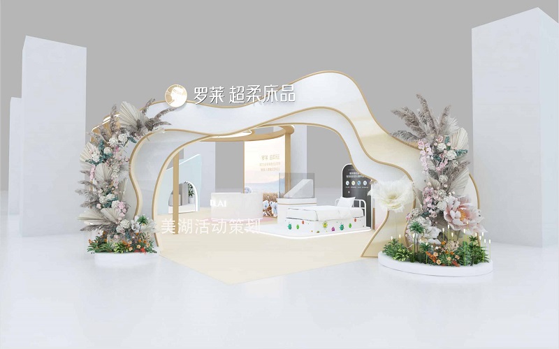大門主入口采用流線型拱門結(jié)構(gòu),以米白色啞光烤漆板材為基底,搭配淺金色金屬包邊勾勒出起伏的曲線輪廓,與 “超柔” 的品牌特質(zhì)呼應(yīng),淡化硬質(zhì)空間的冷傲感。拱門的頂部嵌入發(fā)光字 “羅萊 超柔床品”,暖白色燈光透過半透亞克力板柔和溢出,成為人群視線的第一錨點(diǎn)。