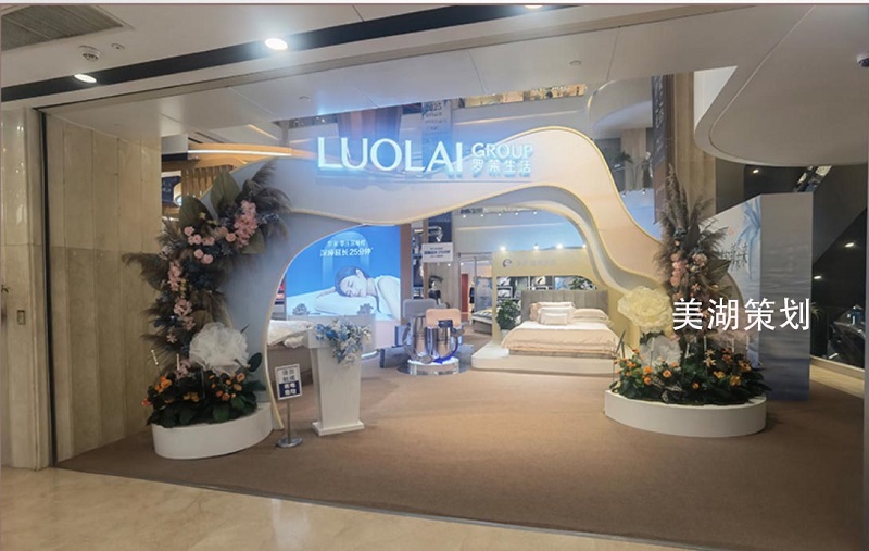 內(nèi)部空間采用 “一廳三區(qū)” 的動(dòng)線規(guī)劃:入口拱門后為過渡廳,地面鋪設(shè)淺米色地毯緩沖人流;核心體驗(yàn)區(qū)陳列羅萊當(dāng)季超柔床品套件,搭配懸浮式床架與柔和的頂光,模擬臥室場(chǎng)景,讓訪客可直接觸摸面料、體驗(yàn)躺臥感;互動(dòng)測(cè)試區(qū)設(shè)置 “柔感檢測(cè)儀”,通過壓力傳感器量化床品的柔軟度,生成專屬睡眠報(bào)告;洽談區(qū)則以淺灰色沙發(fā)搭配小圓桌,為意向客戶提供私密溝通空間。